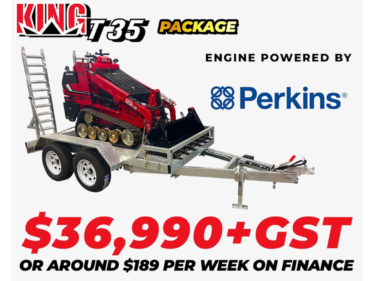 Digger King T35 HP Mini Loader, Bucket and Trailer Premium Package Only $36,990+GST or around $189 per week on finance T35 HP Mini Loader, Bucket and Trailer Premium Package Inclusions: - 4 in 1 bucket - Perkins engine - Load capacity - 400 kg - Weight - 1650 kg - Dimensions - 2694 mm (L) x 1080 mm (W) x 1496 mm (H) - Bucket - 1160mm wide - Super Duty Trailer with 4 wheel electric brakes and easy fold down ramps - Trailer dimensions - 2900 mm (L) plus 1400 for draw bar x 2025 wide x 505 mm (H) - Implement rack - Tie down straps - All set up for you turnkey - 24 months manufacturer's warranty - 4 in 1 Bucket - This allows your T35 HP Mini Loader to Doze, Dig, Dump, Carry, Clamp, Grab, Optional Teeth - Large Alloy Radiator with Cooling Fan - Efficient Cooling of Engine and Hydraulic Oil - Soft touch Joystick Steering Control - One handed easy to operate your T35 HP Mini Loader - Hydraulic Oil Cooler - This means it keep oil temp lower allowing you to operate longer with no issues - 2 x Hydraulic Pumps - This means you have Efficient Separation of Power to Attachments, Bucket Controls, and Wheels with your T35 HP Mini Loader - Auxiliary Hydraulic Outputs - This means you can add many options of external accessories to your T35 HP Mini Loader - Hose Quick Coupler Fittings - This means it eliminates the chance of dirt and other foreign objects getting into your T35 HP Mini Loader - Curved Lift Arms to Facilitate a Radial Lift Pattern - Allows your T35 HP Mini Loader Attachments to Lift 'Up' and 'Out' Increasing Clearance to the Front of the Machine. Handy When Using Large Augers - CNC Manufacturing and Electrophoresis Paint Process - This gives you the unique KING Rust Protection and Excellent Finish - Large Donaldson Air Cleaner Primary/Secondary with Dust Venturi - This means you get longer working hours between services of your T35 HP Mini Loader - Muffler Insulation - This allows the engine to operate cooler allowing you to operate longer with your T35 HP Mini Loader - Hydrostatic Drive Train System - This allows you to do jobs with your T35 HP Mini Loader easily as the hydraulic power is doing the work for you - Japanese NSK Bearings and Grade 60H Chains - Your T35 HP Mini Loader is just like Toyota, designed to be unbreakable - Standard Attachment Mounting Plate - This means you can buy attachments anywhere you like for your T35 HP Mini Loader or use ones you may have already - Operator Platform Suspension - This means when you are working on your T35 HP Mini Loader your comfort is number 1 allowing you to work longer and easier day in, day out - Gauges and Warning Lights - These gauges point out any issues, meaning you can stop the machine and rectify before any damage is caused allowing your T35 HP Mini Loader machine a long reliable service life. - Service Kit and Tools - Included free is a tool box and service kit this means you wont have to go digging for tools if you need to service or adjust something on your T35 HP Mini Loader - Hose Protection Kevlar sleeving - This prevents burst in hoses once again extending the life of your T35 HP Mini Loader - Track Drive with Grease Tensioner and Heavy Duty Re-coil Spring - This T35 HP Mini Loader design gives you better traction and lighter foot print meaning go any where with almost no trace - Engine Access Panel Hinged and Lockable - This gives you easy access to all your components of your T35 HP Mini Loader - Heat-Treated Pins and Greaseable Bronze Bushes - This gives you longer life for your T35 HP Mini Loader - Tie Down Locations - Safe Security for Transporting for your T35 HP Mini Loader - Emergency Stop Switch - Quick and easy to hit in case of any issues while operating the machine, all standard on the T35 HP Mini Loader - Lift Hook Locations - This means if you have to life your machine on to a site via a crane etc it can be done easily with out any risk to your T35 HP Mini Loader - Lift Arm Safety Support - This means you are safe when using your T35 HP Mini Loader T35 HP Mini Loader 3900 Combo - Massive 3900mm Super Duty Trailer WITH Attachments Only $53,990+GST or around $269 per week on finance - 4 in 1 Bucket - Heavy Duty Trailer - 3900mm - Heavy Duty Set Of Forks - Trencher Attachment - Auger Driver With All 3 Auger Bits - 150mm, 200mm, 300mm - Mounting Kit For Trencher - Chain Down Kit - Tool Box Kit - Filter Kit - Machine Load Capacity - 400 kg - Machine Weight - 1650 kg - Machine Dimensions - 2694 mm (L) x 1080 mm (W) x 1496 mm (H) - Trailer Dimensions - 3900 mm (L) plus 1400 for draw bar x 2025 wide x 505 mm (H) - Warranty - 12 months parts and labour, 36 month parts warranty XL Digger Tipper Trailer Upgrade $6,990 + GST or around $35 per week on finance - Upgrade your standard trailer package to the XL digger tipper including: - Specialised removable implement rack - easy to lift out implement rack without having to reach over or remove the cage every time you need to change implement on site - Removeable cage - allows you to easily unbolt the steel cage so you can use your trailer at 2 different heights, depending on your job - Built in ramps - stored underneath the trailer for simple loading and unloading of your machine - Remote controlled hydraulic tipper with 5 stage ramp - heavy duty tipper with easy to access hydraulic lines, battery and remote so maintenance is as simple as possible - Extra heavy duty reinforced floor - allows you to tow your machine and implements safely and easily, or use the trailer for tipping dirt, timber, gravel etc - Hot dipped galvanised steel trailer - ensuring longer lifespan of your trailer as we only build premium hot dipped galvanised steel Engine Engine Make Perkins (USA) Fuel Type Diesel Rated Power 35 hp (23.8 kw) Electrical 12 Volt Hydraulic System Pump Brand Hansa TMP (Italian) x 2 Valve brand Hydra Control Joystick (Italian) Pressure 2610 PSI (180 Bar) Flow 36 L/Min Cooler Alloy Radiator Driving System Motor Brand Danfoss (Denmark) Pressure 3625 PSI (250 Bar) Flow 62.4 L/Mi