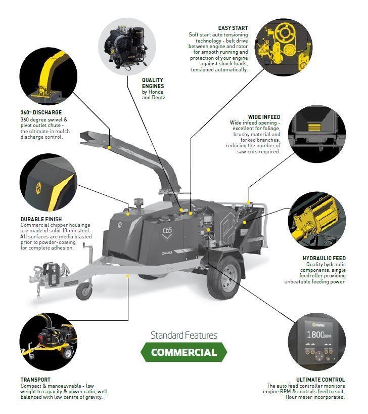 The combination of 360 degree turntable with 270 degree swivel outlet chute makes this chipper the ultimate in access and mulch discharge control. Unbeatable weight to capacity & power ratio, well balanced with low centre of gravity.
