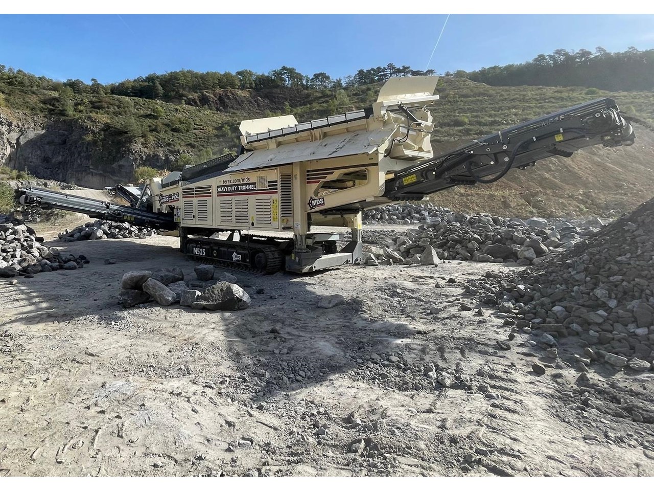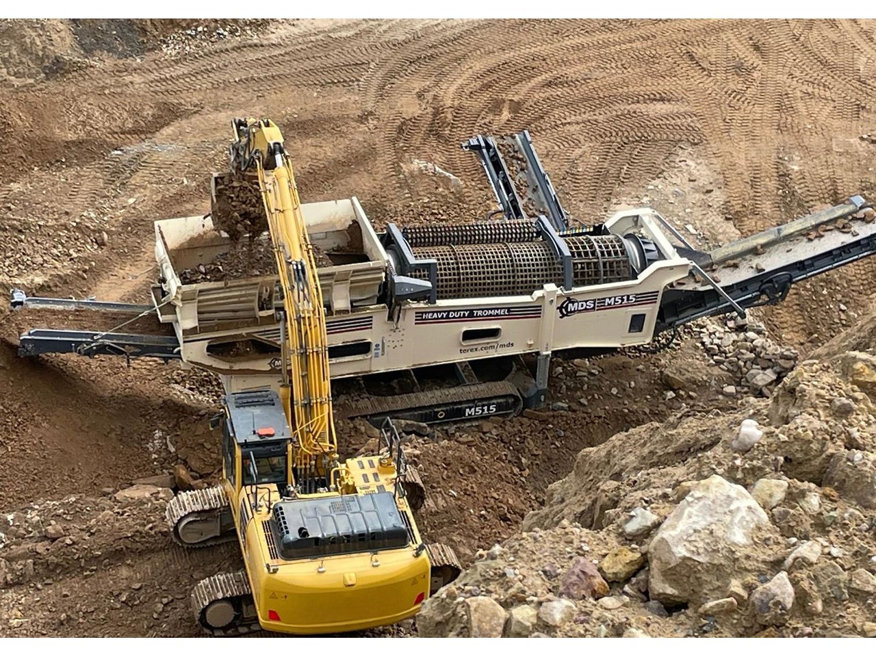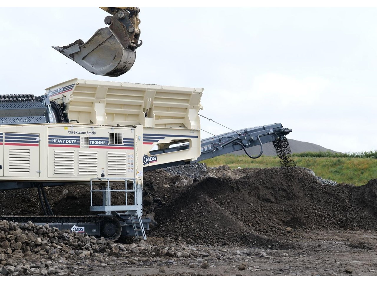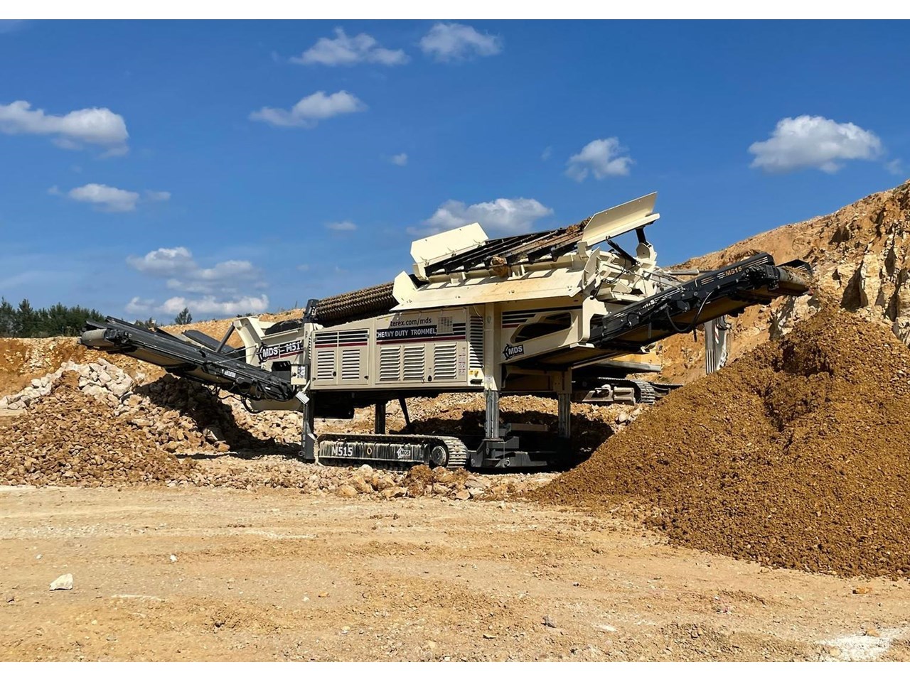 The Terex MDS M515 Heavy Duty Trommel, the flagship model in the Terex MDS range. It excels at crafting RipRap and reclaiming rocks entangled with clay and other adhesive materials. The updated design incorporates new elements that enhance transportation, accessibility, and stockpile capacities.