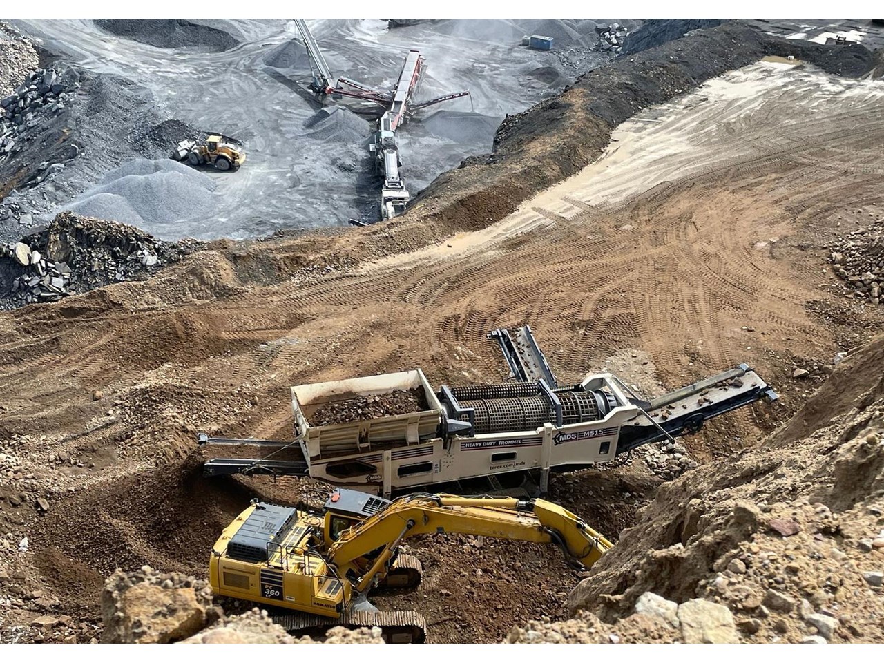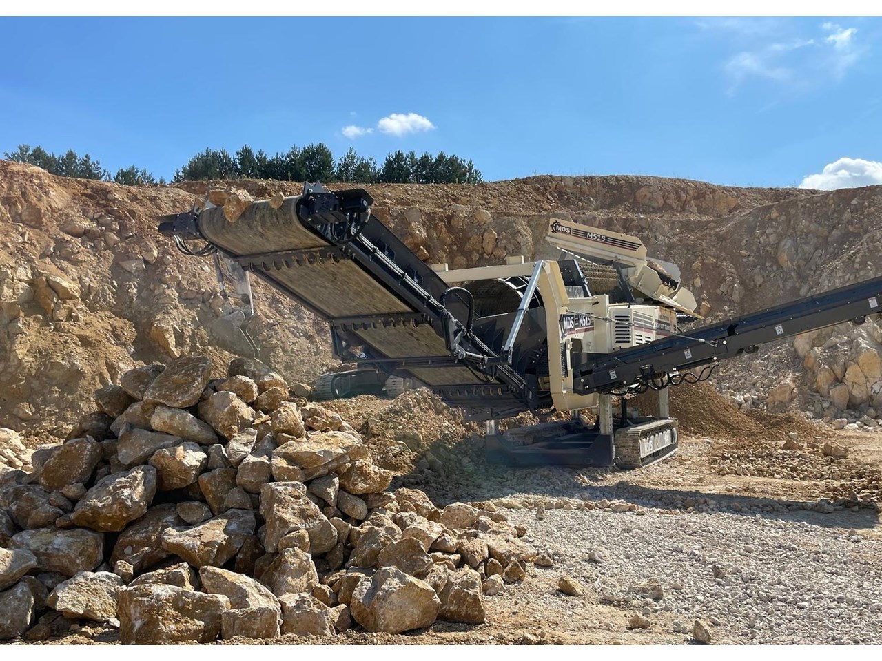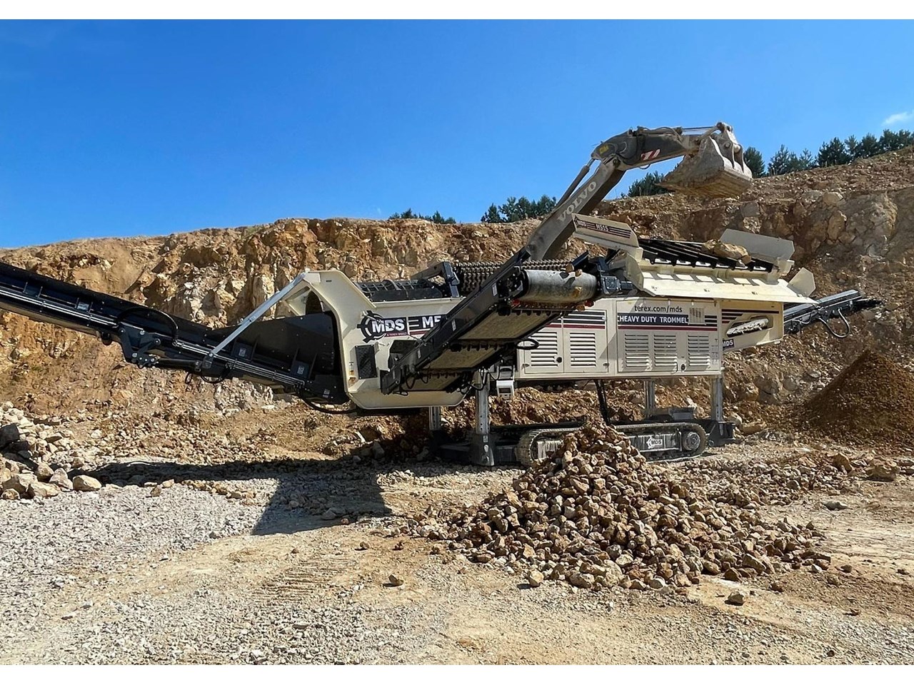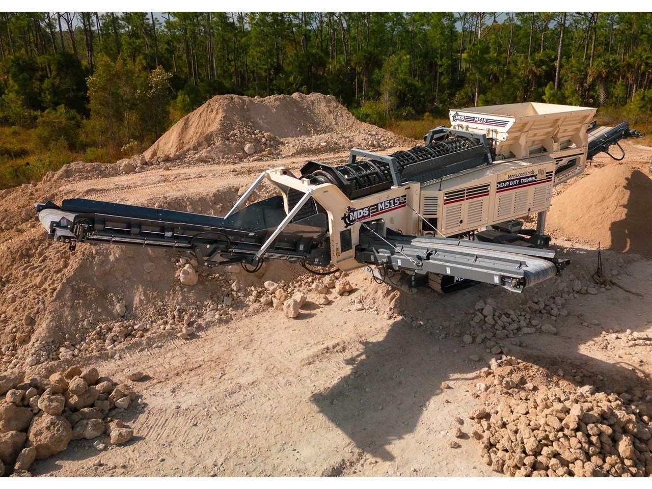 The Terex MDS M515 Heavy Duty Trommel, the flagship model in the Terex MDS range. It excels at crafting RipRap and reclaiming rocks entangled with clay and other adhesive materials. The updated design incorporates new elements that enhance transportation, accessibility, and stockpile capacities.